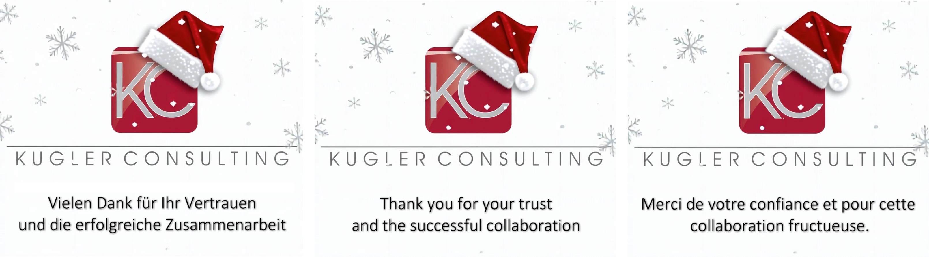 ![]() | Liebe Kundinnen und Kunden, liebe Partnerinnen und Partner, liebe Lieferanten, ein anspruchsvolles und zugleich erfolgreiches Jahr 2025 neigt sich dem Ende zu. Wir möchten diese Gelegenheit nutzen, um uns herzlich für die vertrauensvolle und konstruktive Zusammenarbeit in den vergangenen Monaten zu bedanken. Gemeinsam konnten wir Projekte vorantreiben, neue Lösungen entwickeln und bestehende Partnerschaften weiter stärken. Dieses Vertrauen und die Zusammenarbeit sind die Grundlage unseres gemeinsamen Erfolgs. Nach einer kurzen Pause zum Jahreswechsel freuen wir uns darauf, auch im kommenden Jahr neue Herausforderungen gemeinsam anzugehen und innovative Ideen umzusetzen. Wir wünschen Ihnen und Ihren Familien eine besinnliche Weihnachtszeit, erholsame Feiertage sowie einen guten Start in ein gesundes und erfolgreiches neues Jahr. Herzliche Grüße -- Dear Customers, Partners and Suppliers, As 2025 comes to an end, we would like to thank you for the trust and successful cooperation throughout the year. Together, we have developed solutions, advanced projects and strengthened long-term partnerships. We look forward to continuing this collaboration in the coming year and wish you a joyful holiday season and a successful start to the new year. Kind regards -- Chers clients, partenaires et fournisseurs, Alors que l’année 2025 touche à sa fin, nous souhaitons vous remercier pour la collaboration fructueuse et la confiance accordée tout au long de l’année. Ensemble, nous avons mené à bien des projets, développé des solutions innovantes et renforcé nos partenariats. Nous nous réjouissons de poursuivre cette collaboration au cours de l’année à venir et vous souhaitons de joyeuses fêtes ainsi qu’une excellente nouvelle année. Meilleures Salutations KuglerConsulting GmbH |